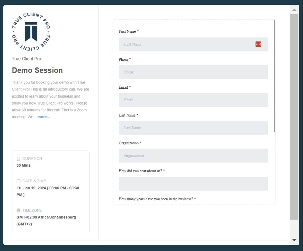 During the Discovery Call, if you express interest in exploring True Client Pro further, our Sales Team will provide you with a sign-up link for your 7-day free trial. Additionally, we’ll schedule a complimentary 30-minute Onboarding session once you have started your trial to familiarize you with each feature before you fully immerse yourself in the experience.
