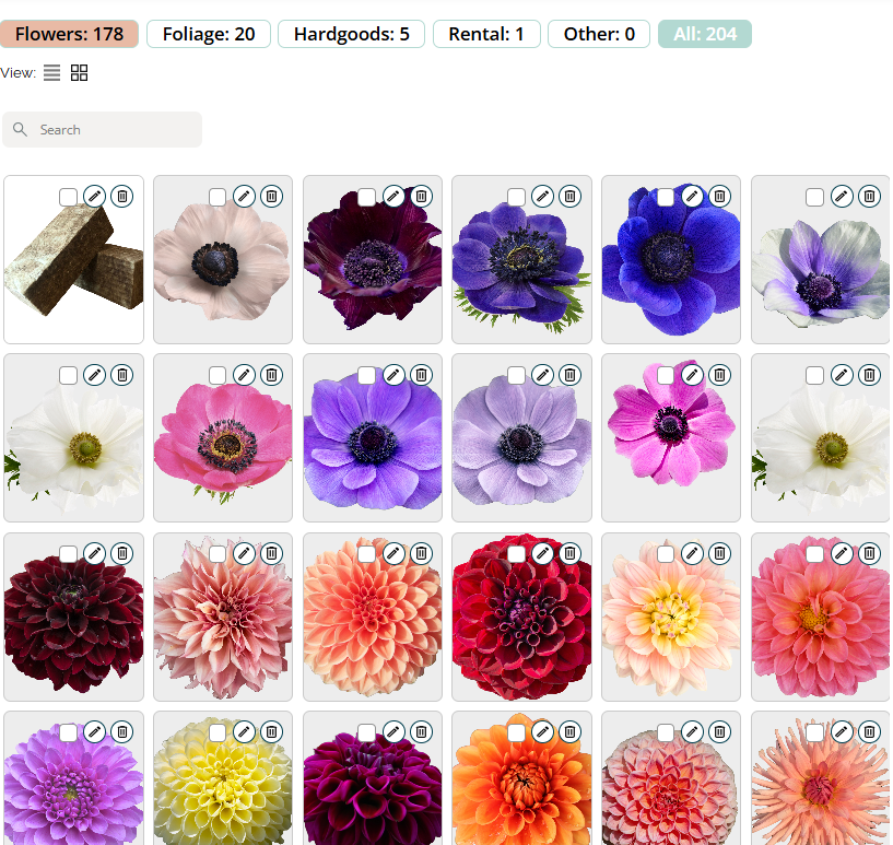 Use the top filters (Flowers, Foliage, Hardgoods, Rental, Other). View as Grid for data, or Image for creative planning.