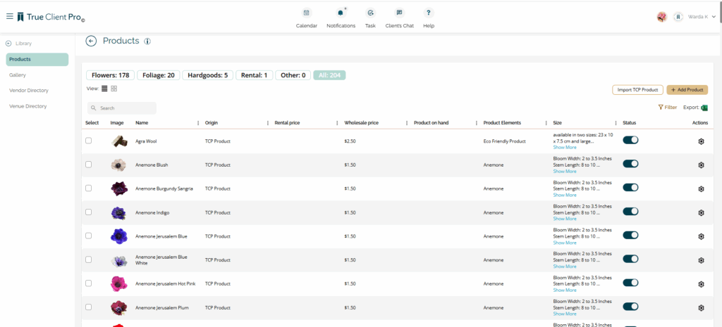 - Import TCP Product to bulk-add curated flowers, foliage, hardgoods, rentals, and more.